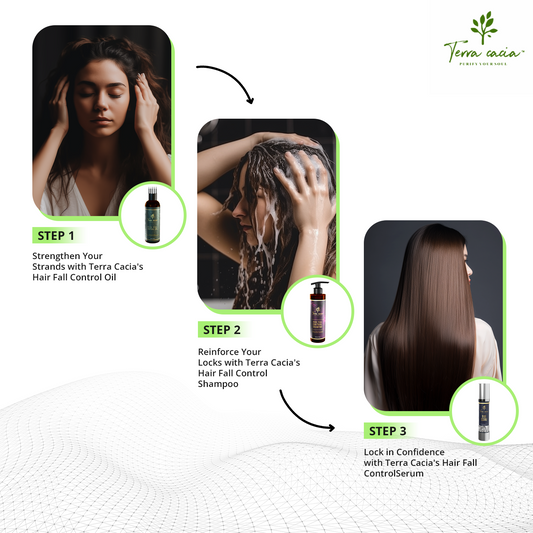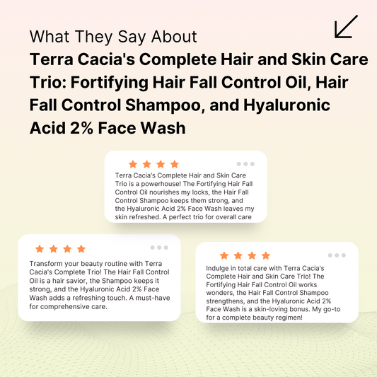 Terra Cacia's Complete Hair and Skin Care Trio: Fortifying Hair Fall Control Oil, Hair fall control shampoo, and Hyaluronic Acid 2% Face Wash with Head Massager