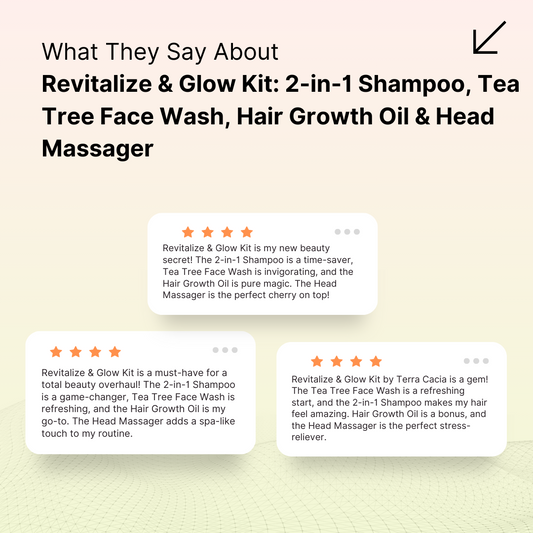 Revitalize & Glow Kit: 2-in-1 Shampoo, Tea Tree Face Wash, Hair Growth Oil & Head Massager