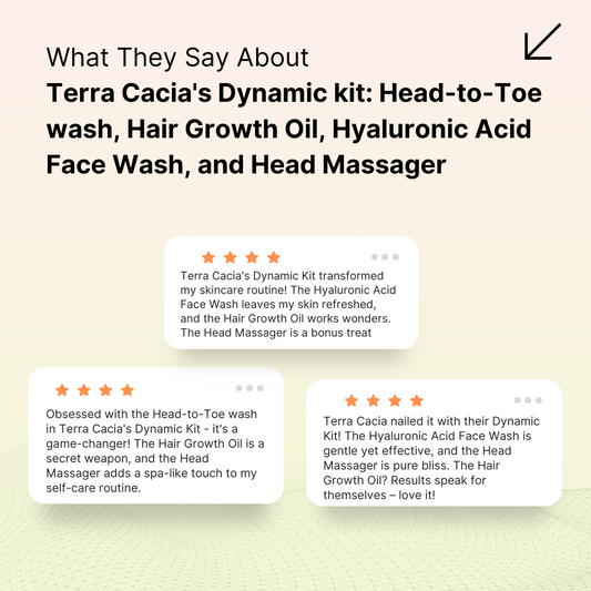 Terra Cacia's Dynamic kit: Head-to-Toe wash, Hair Growth Oil, Hyaluronic Acid Face Wash, and Head Massager