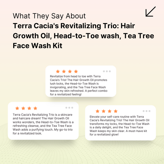 Terra Cacia's Revitalizing Trio: Hair Growth Oil, Head-to-Toe wash, Tea Tree Face Wash Kit