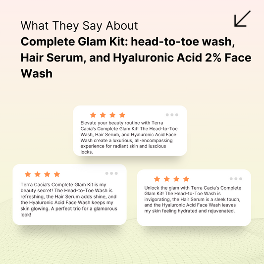 Complete Glam Kit: head-to-toe wash, Hair Serum, and Hyaluronic Acid 2% Face Wash with Head Massager