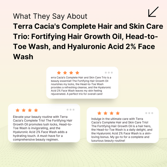 Terra Cacia's Complete Hair and Skin Care Trio: Fortifying Hair Growth Oil, Head-to-Toe Wash, and Hyaluronic Acid 2% Face Wash